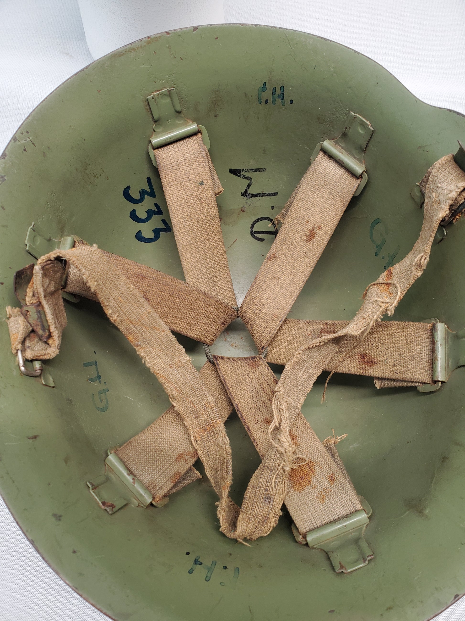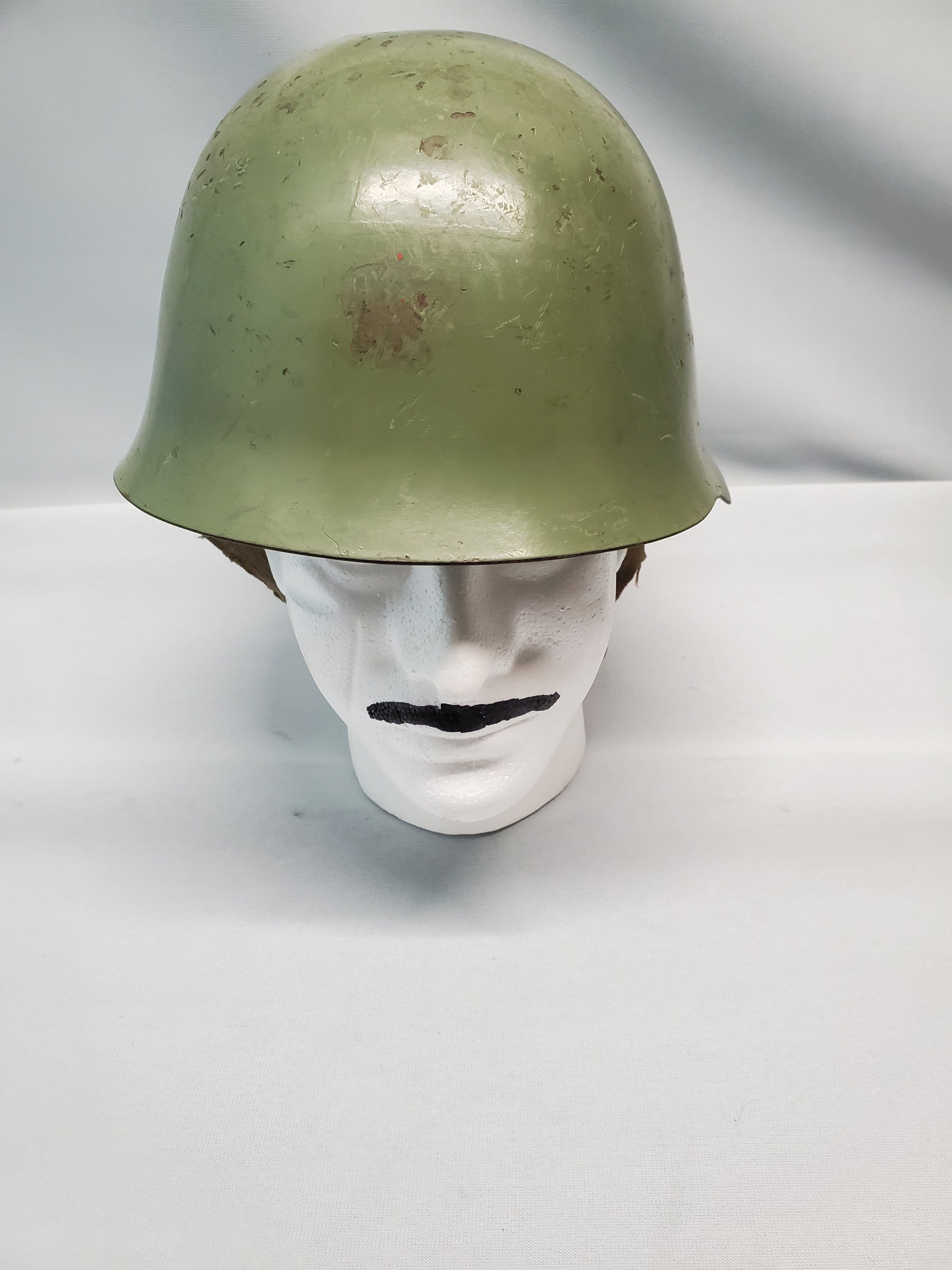 This is a Yugoslavian NE44 steel helmet, issued to the yugo army during the Cold War years, and even into the 1990s during the balkans civil wars. THe helmet is painted a light green, the liner is a cotton/canvas lie straps with a torn chin strap.