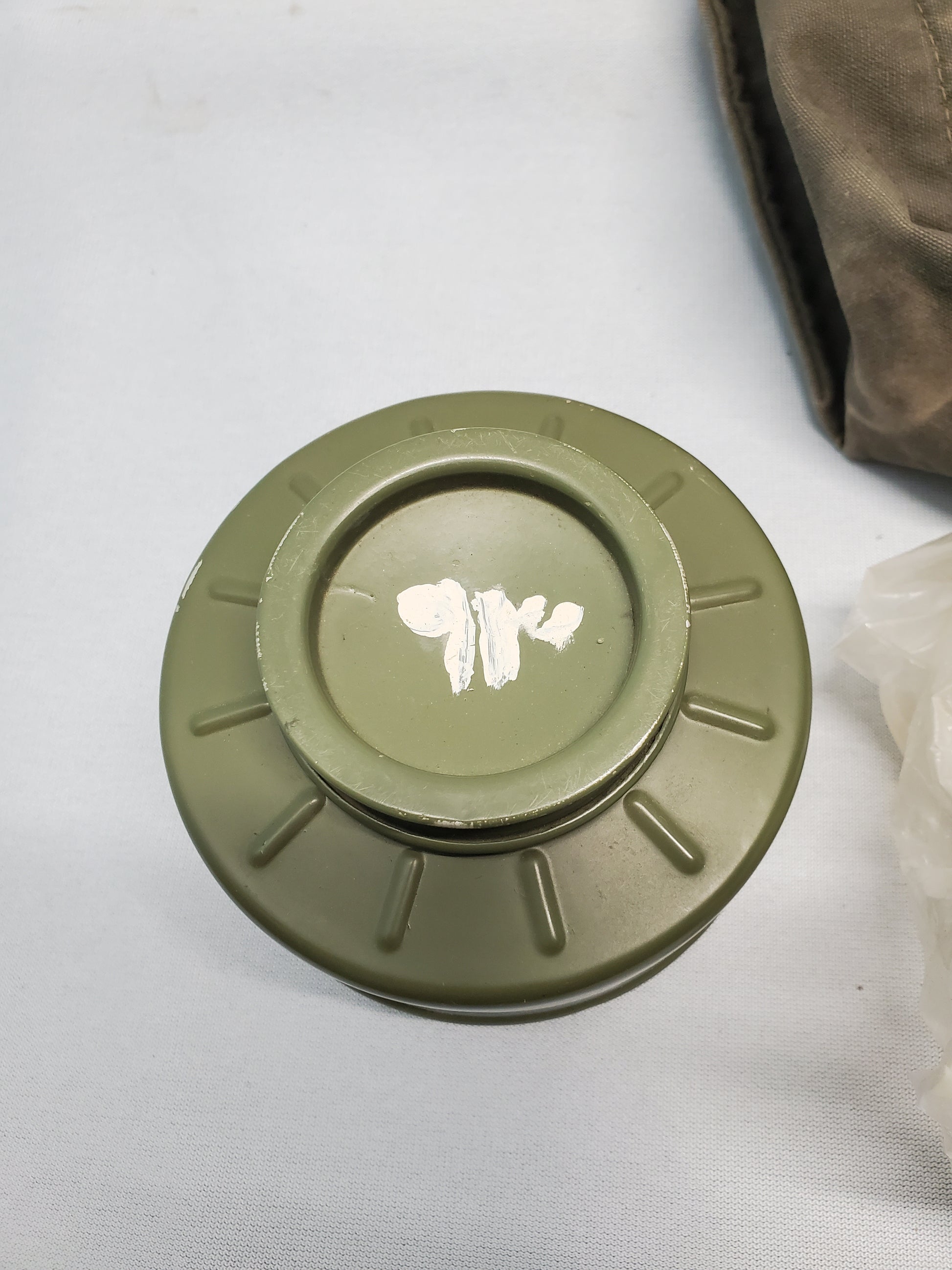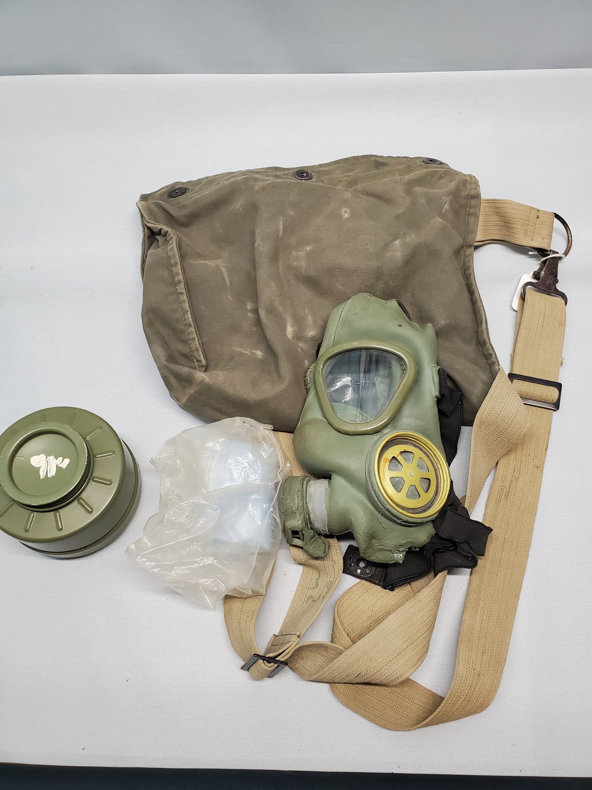 This Gas mask has a screw on filter, the filter internals have been removed for safety. The canvas bag does have some Arabic writing on it. Basically what you see in the picture is what you get. This gas mask is a great pice of war history. Note(This is a war bring back and like moist thing that have sat in the hot desert sun,this gas mask is not wearable.Also has a cracked lens.)