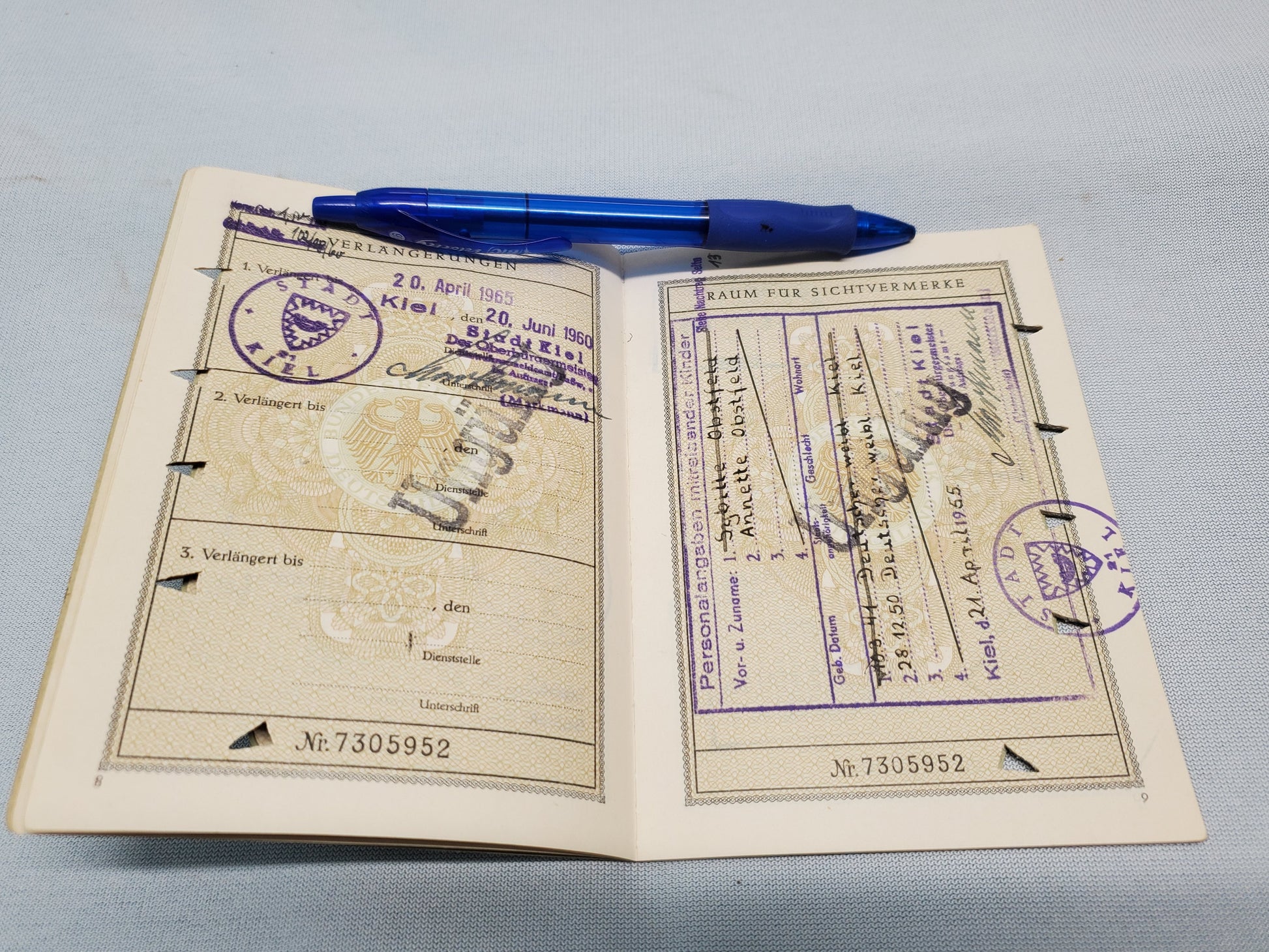 You will receive two passports one from the 1950 and the other from 1960s. Both have signs of use, with travel stam[s. the soft sover passport does have hole punch through it, done years ago to void it.